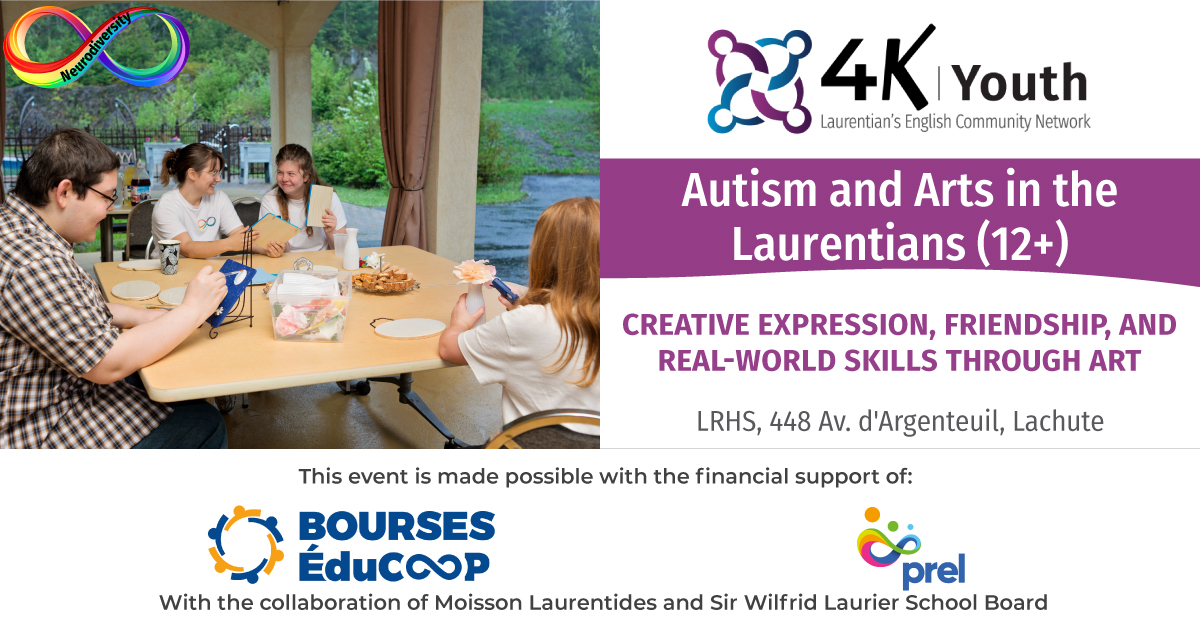 Autism and Arts in the Laurentians (AAL) is a welcoming weekly after-school club where neurodivergent teens and young adults can discover their talents through hands-on art activities like painting, crafts, music, design, and more. No experience required!