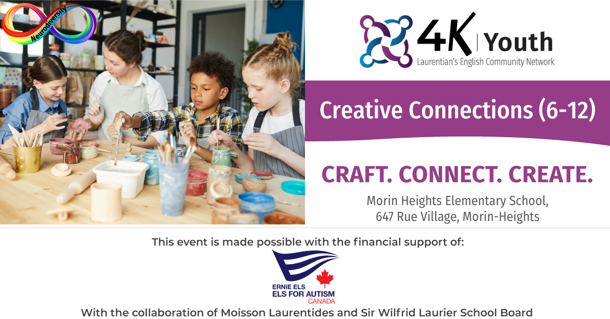 As part of 4Korners Neurodiversity initiative, Creative Connections Jr is designed to support youth with Autism, ADHD, or any unique learning differences. Each session combines creative exploration and opportunities to build life skills, boost confidence, and enjoy meaningful social interactions; all in a safe, inclusive, and encouraging environment.