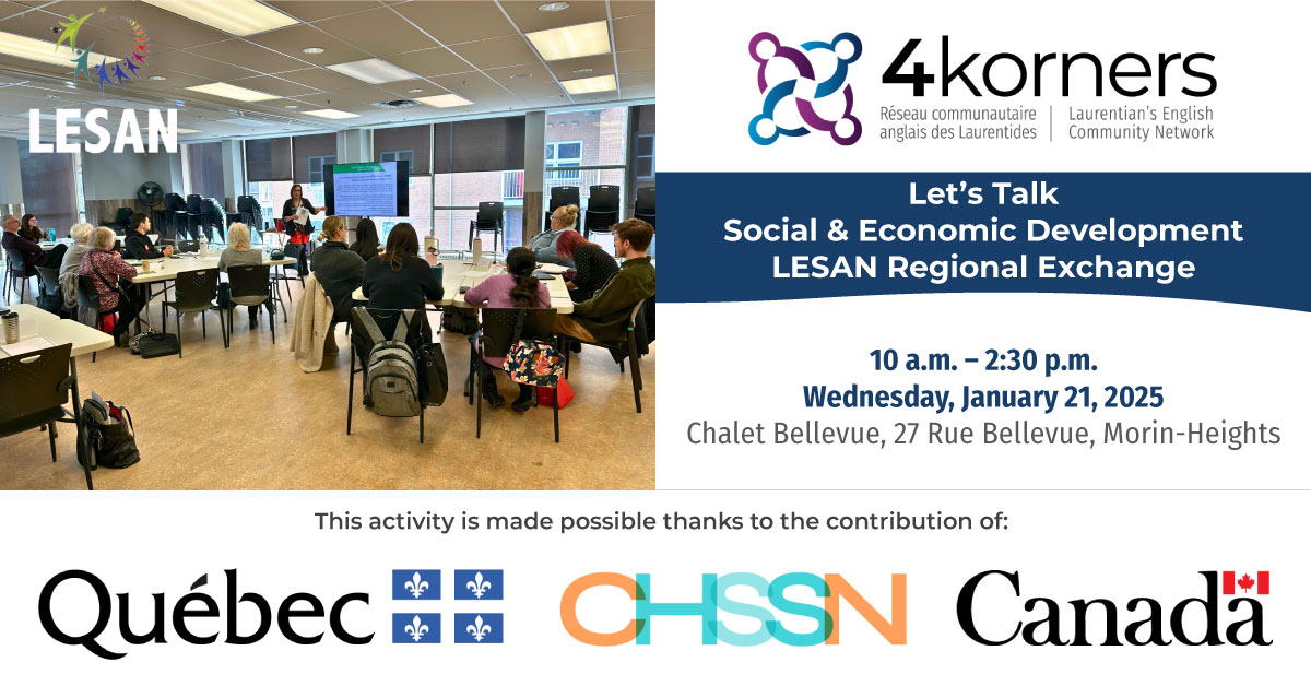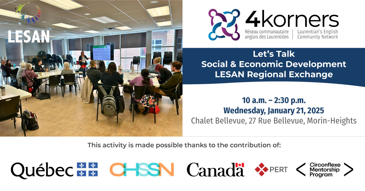 This event is part of 4Korners’ Social & Economic Development Program, supporting equity, access, and inclusion for English-speaking residents of the Laurentians.